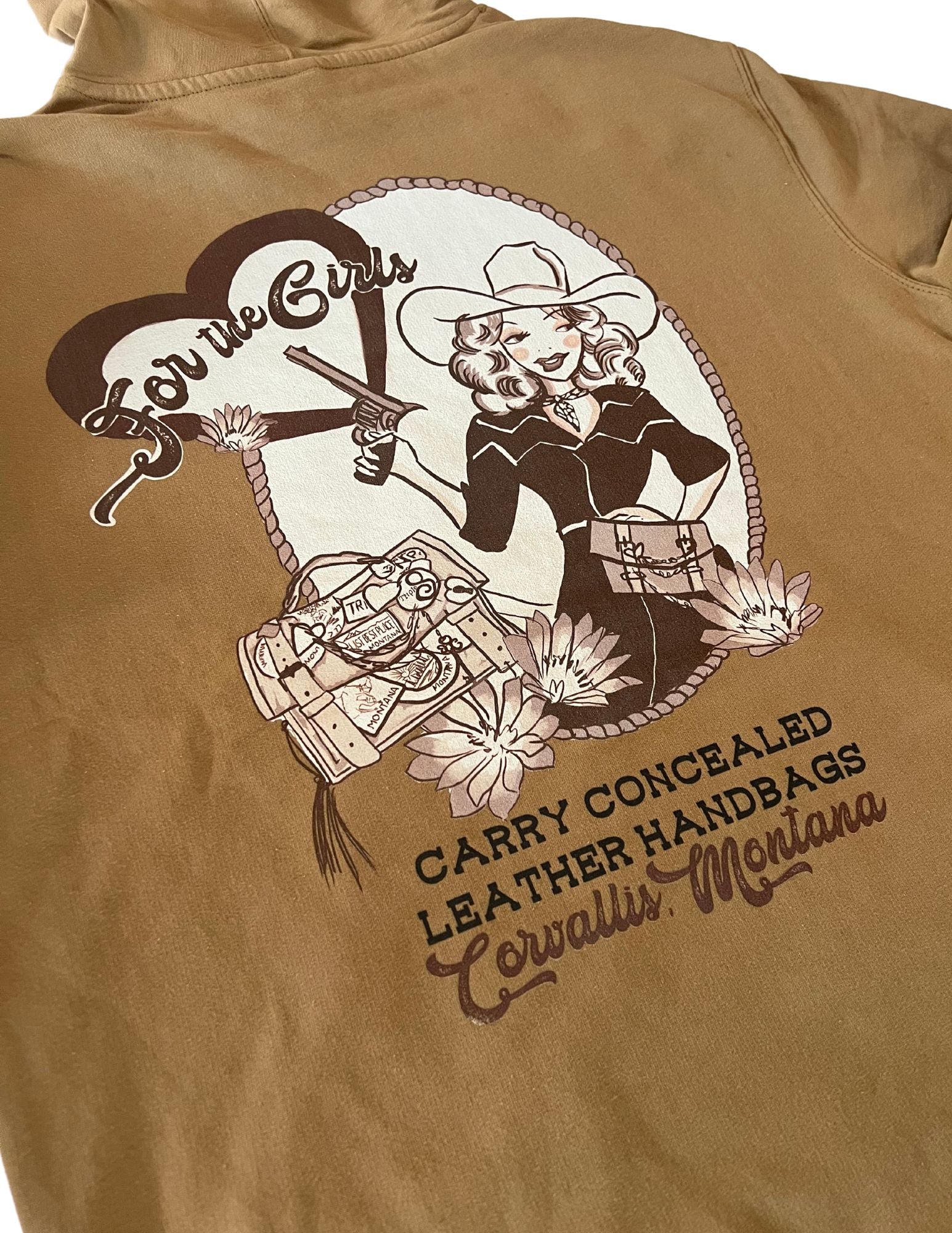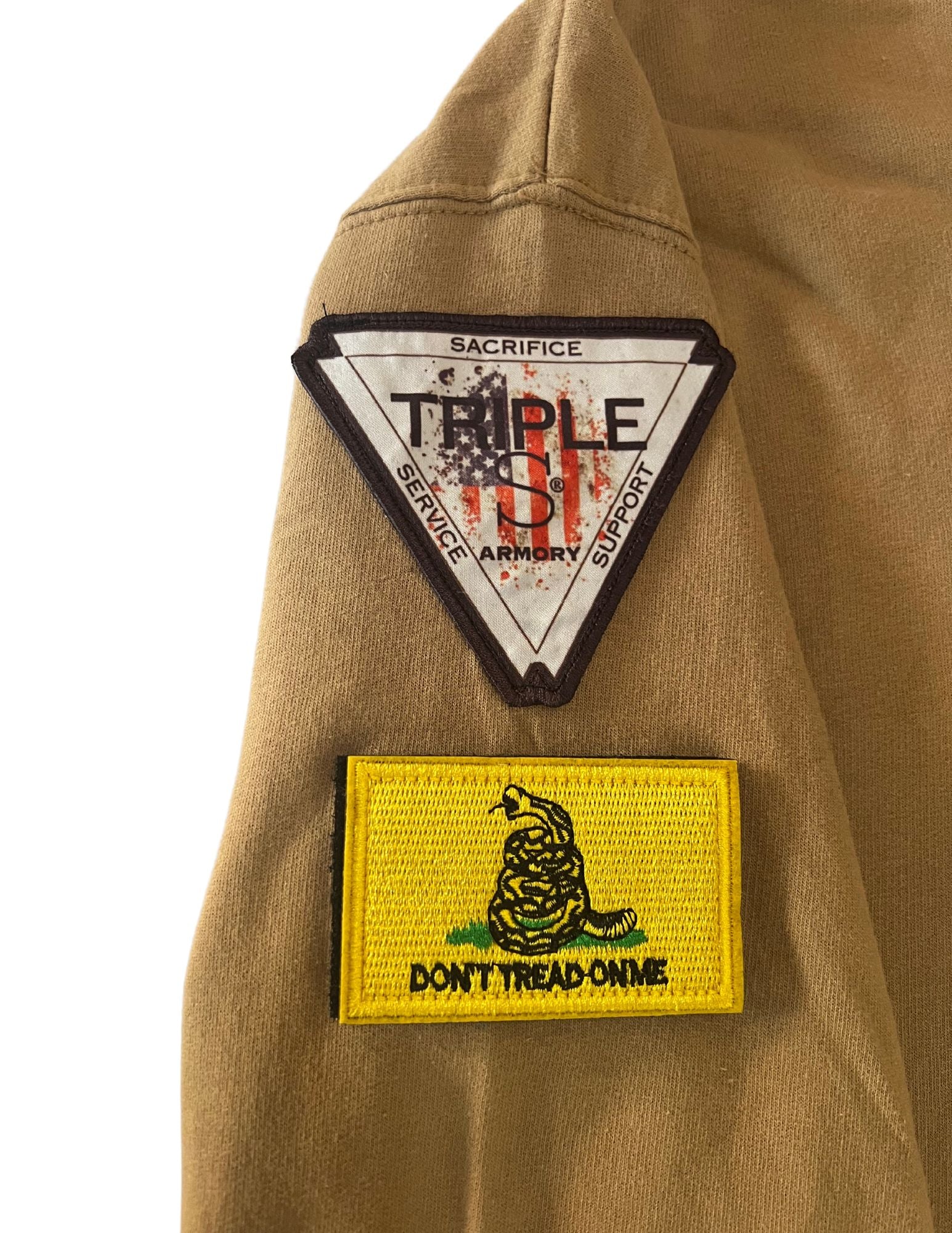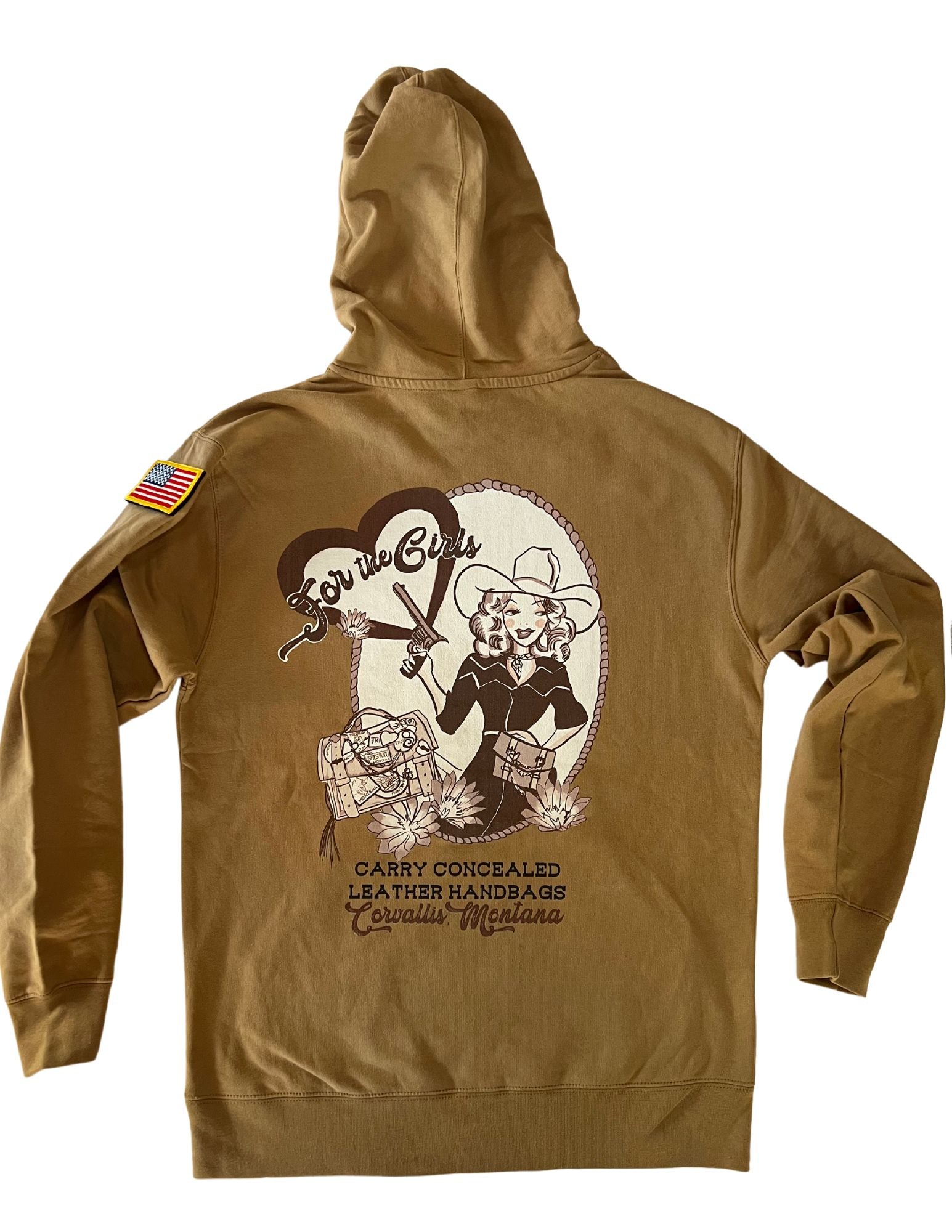 This women's sweatshirt has a logo on the front left and patches on each sleeve. Triple S patch, Gadsden Flag and American Flag. Both Flag patches are removable. The back of the sweatshirt features original artwork by a local Montana artist made for Triple S and is a western pin up girl enclosed in western roping with western lettering "For the Girls". Support our small business, women and our constitutional right to bear arms. Size Medium.