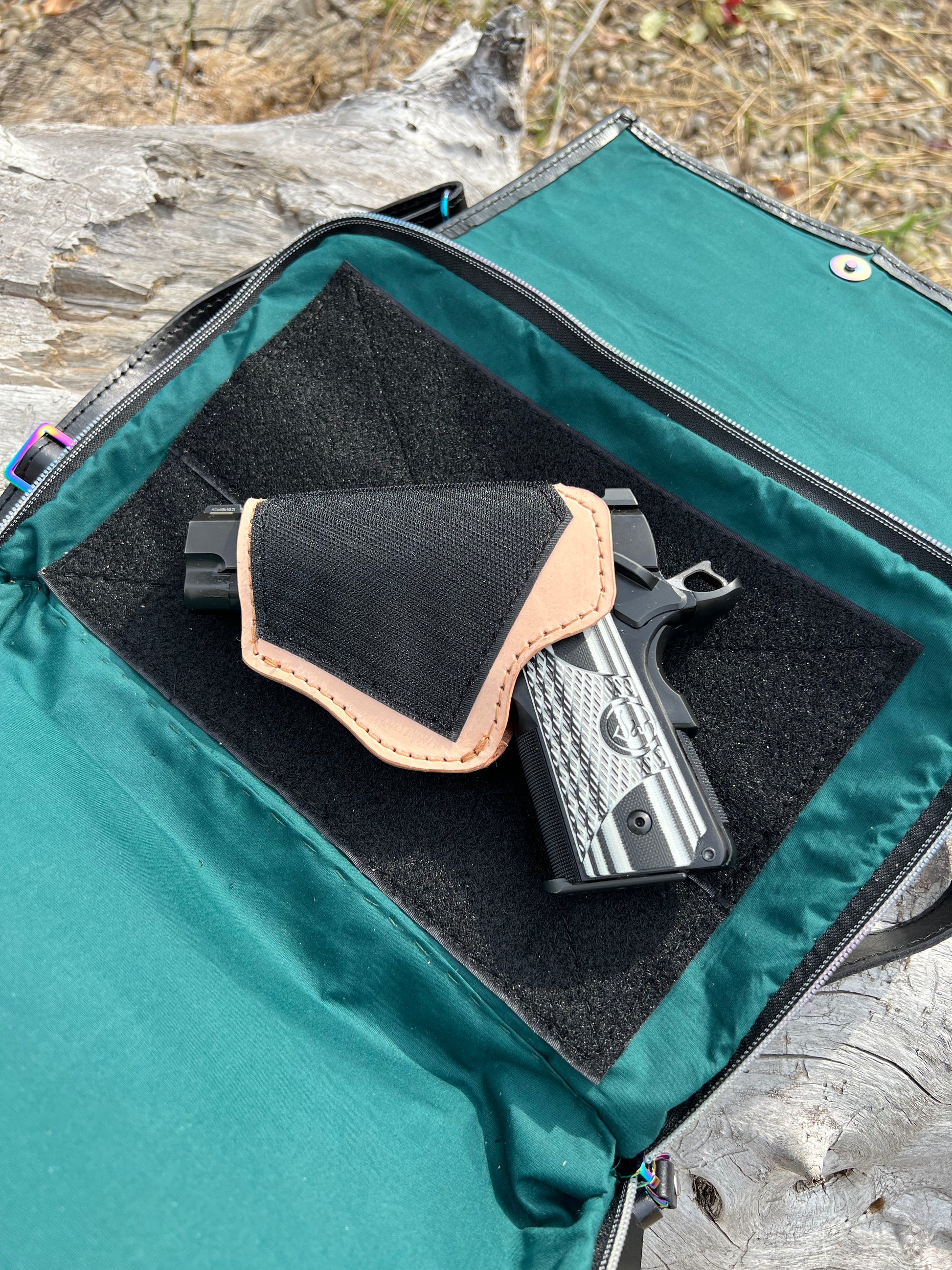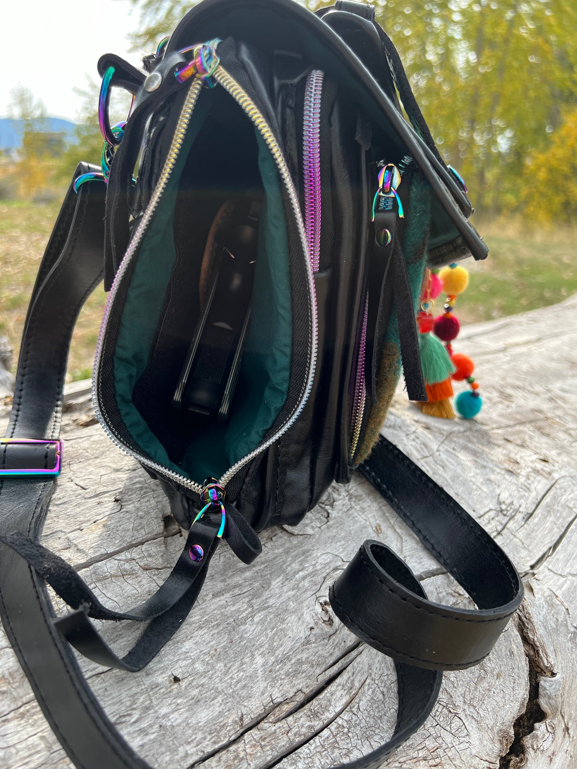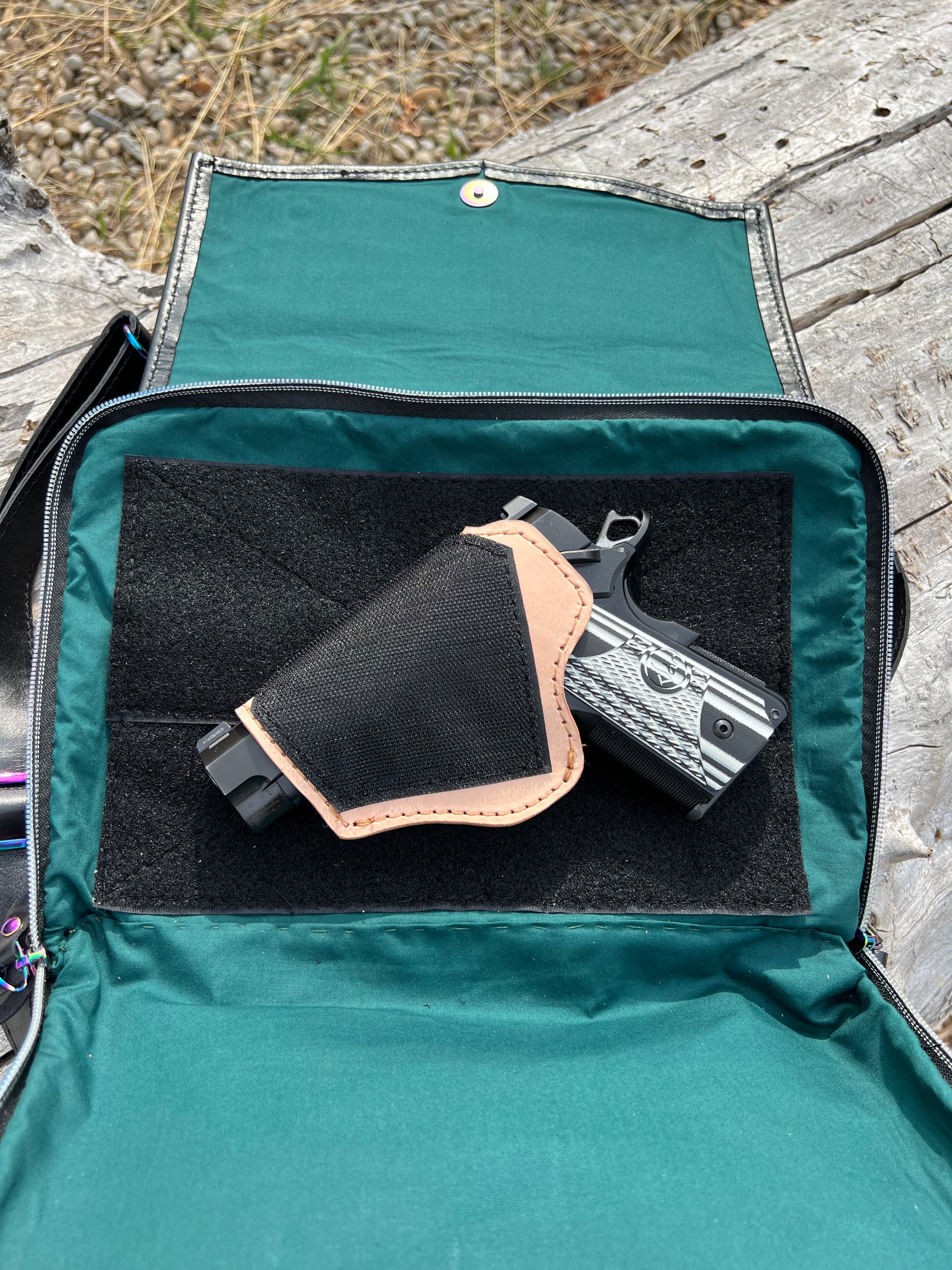 This women's carry concealed bag is made from top grain leather and reclaimed wool blanket and has rainbow hardware throughout the bag. A built in wallet holds 6 credit cards, two pens, has a D ring to clip keys to, has a sunglasses pocket and an interior cell phone pocket. The middle zipper pocket is secured with a double zipper and has an interior slip pocket. The back pocket is the firearm pocket and is right or left draw friendly. You do not need to open the flap to access the firearm pocket. A leather holster that fits most compact guns (pictured is a Dan Wesson eco 1911) is included. Velcro on both sides of the holster allows it to be reversed for left draw. Additionally, the roomy pocket allows you to cant your weapon to your preference. The back of the bag has an exterior slip cell phone pocket for quick access to your phone.