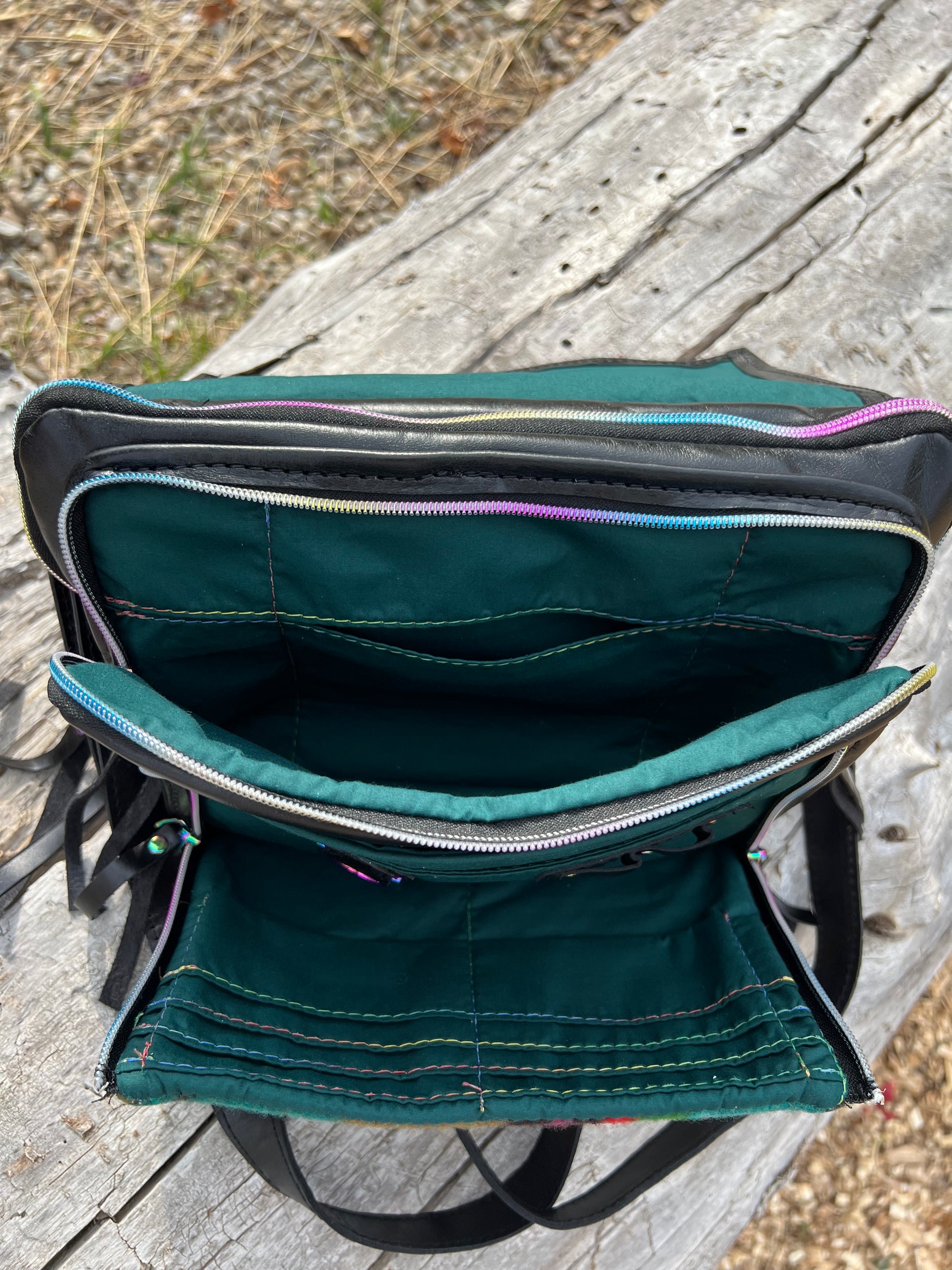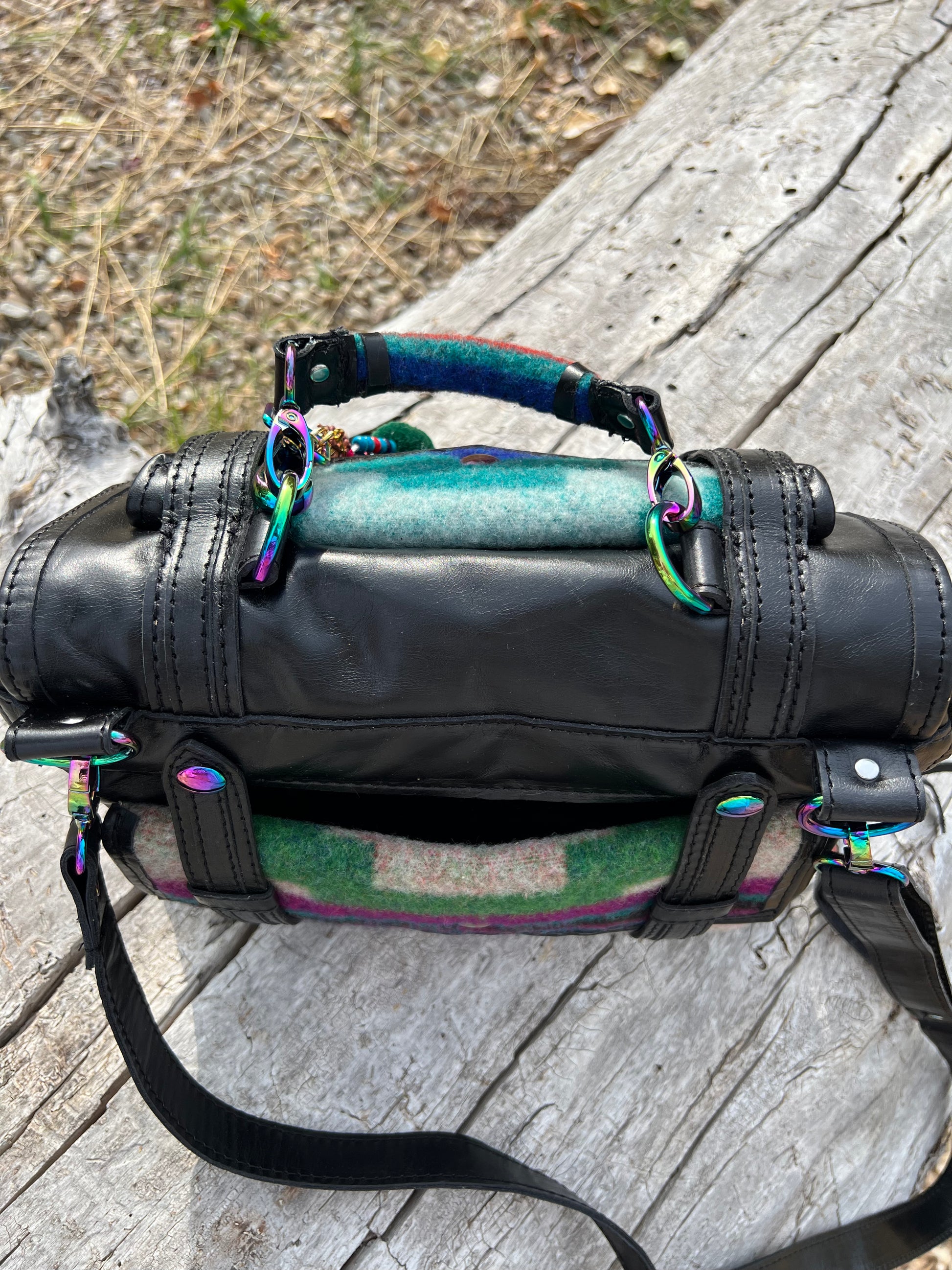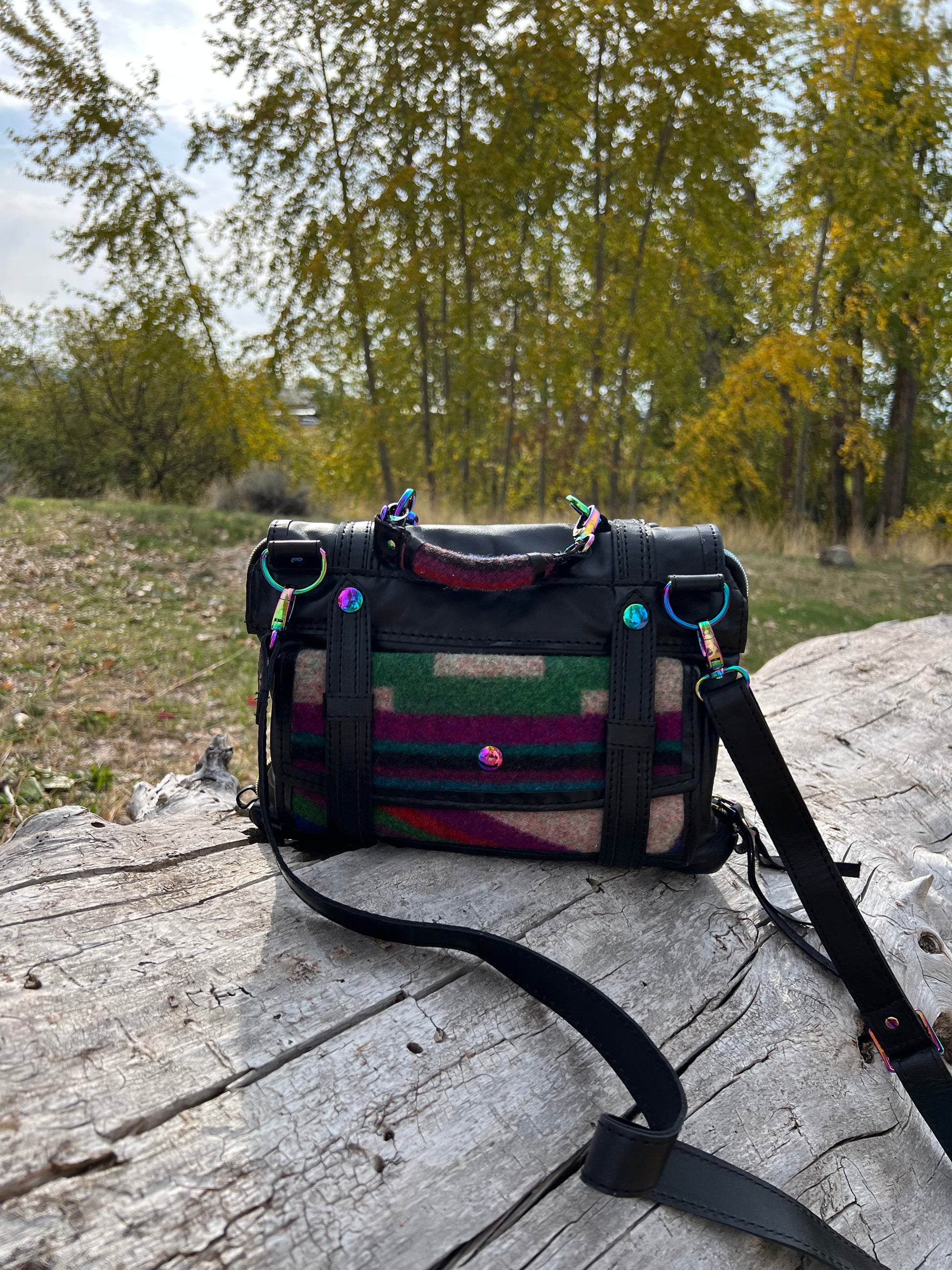 This women's carry concealed bag is made from top grain leather and reclaimed wool blanket and has rainbow hardware throughout the bag. A built in wallet holds 6 credit cards, two pens, has a D ring to clip keys to, has a sunglasses pocket and an interior cell phone pocket. The middle zipper pocket is secured with a double zipper and has an interior slip pocket. The back pocket is the firearm pocket and is right or left draw friendly. You do not need to open the flap to access the firearm pocket. A leather holster that fits most compact guns (pictured is a Dan Wesson eco 1911) is included. Velcro on both sides of the holster allows it to be reversed for left draw. Additionally, the roomy pocket allows you to cant your weapon to your preference. The back of the bag has an exterior slip cell phone pocket for quick access to your phone.