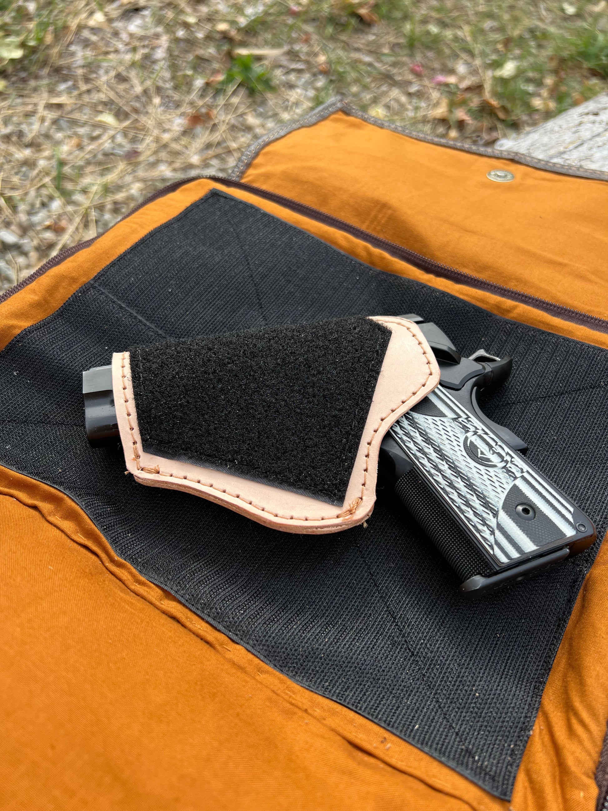 This Carry Concealed Bag is made from brown distressed leather and has a built in wallet with 8 credit card slots, two pen holders, a D ring for key clip in and an interior cell phone pocket. The center pocket is secured with dual zippers, has a large compartment and an interior slip pocket. The firearm pocket is also secured with dual zippers, comes with a leather holster that fits most compact firearms and is left or right draw friendly. The flap does not need to be open to access the firearm pocket. We recommend positioning the zippers on the side towards the bottom that is accessible for the side you draw on. The back of the bag has an exterior cell phone slip pocket, making it easy to access your phone quickly.
