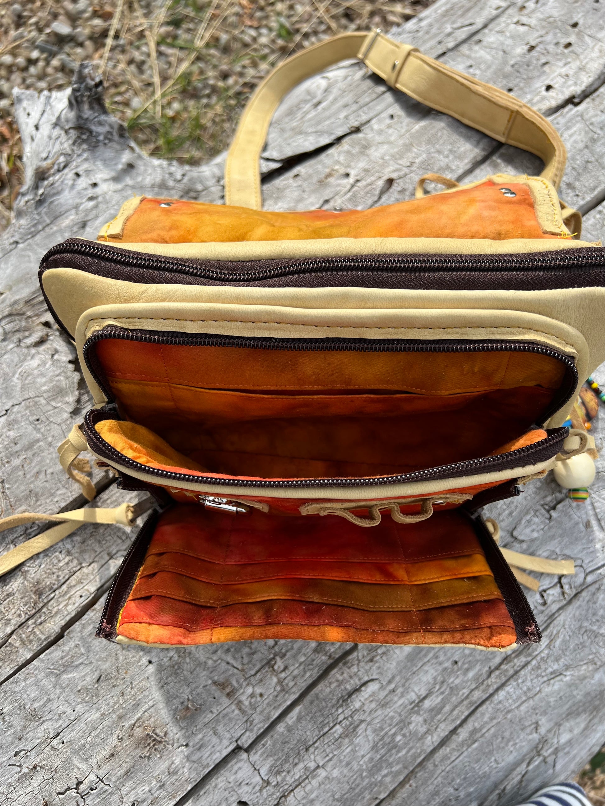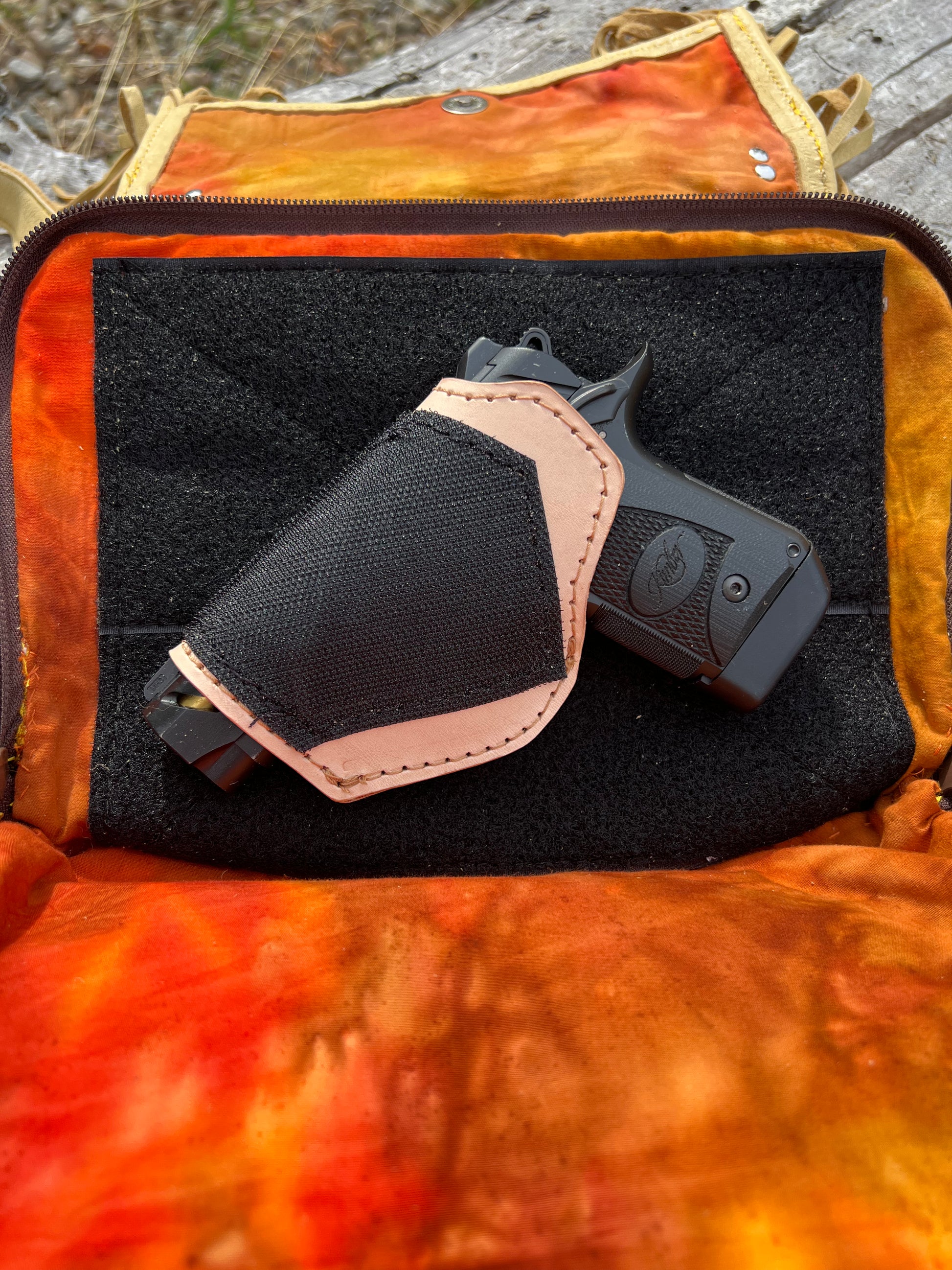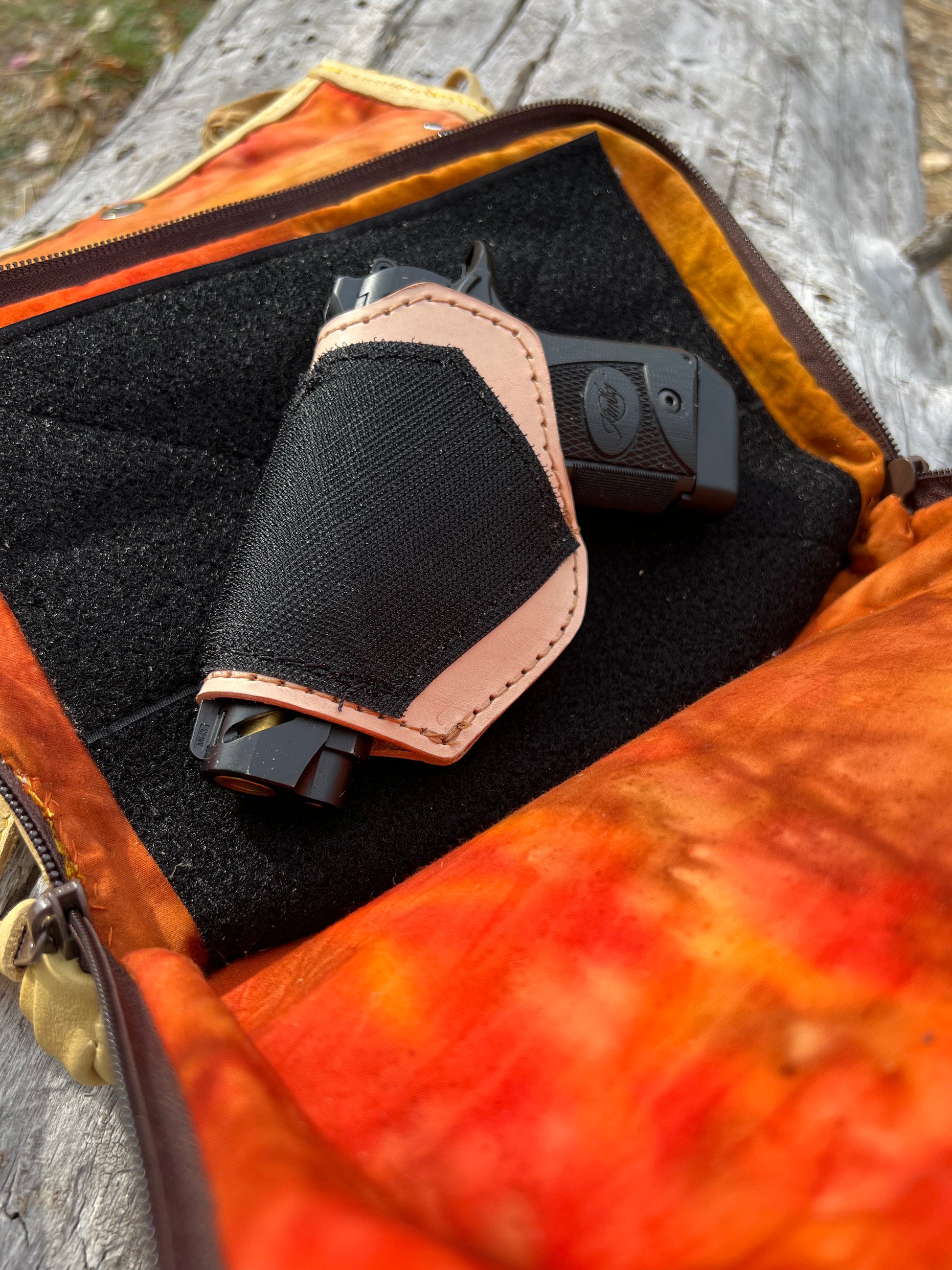 This fringed carry concealed bag is made from Elk hide that was sourced locally and is incredibly soft to the touch. Under the flap you have a built in wallet with three credit card slots, two pen holders and a D ring to clip in keys as well as an interior cell phone pocket. Behind that is a large pocket secured with dual zippers that has an interior slip pocket. The last pocket located at the back of the bag is the firearm pocket. The firearm pocket is left or right draw friendly and the flap does not need to be up to access it. A leather holster with velcro on both sides is included and will fit most micro firearms (pictured is a Kimber Micro 9). We recommend placing the dual zippers on the firearm pocket on the side that you draw from for easy access. The back of the bag has an exterior firearm pocket as well as a pocket secured with a snap. This bag comes with a top handle, an adjustable crossbody strap and a 2" wide 19" long strap for shoulder carry.